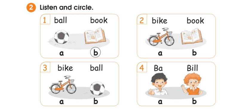 Hướng dẫn: Yêu cầu bài 2 là con cần nghe và khoanh tròn vào chữ cái a hoặc b tương ứng với tranh được nhắc đến. Để làm tốt, trước khi bật băng nghe, con cần quan sát cả 4 tranh một lượt, đọc lại các từ vựng xuất hiện trong đó. Khi đã nắm được cơ bản nội dung tranh, hay bắt đầu nghe và chọn đáp án.