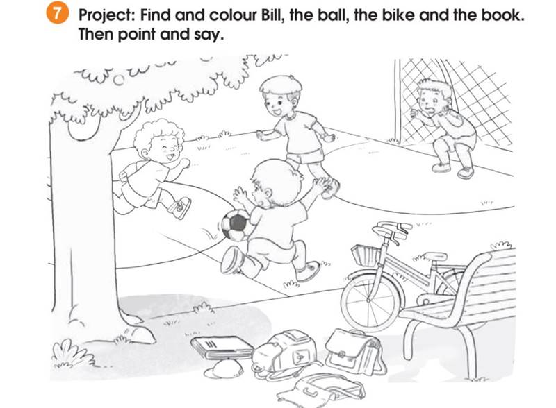 Exercise 7: Project. Find and colour Bill, the ball, the bike and the book. Then point and say.