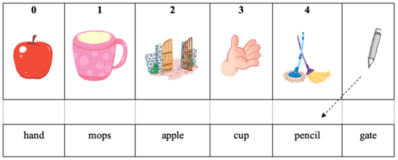 Các loại quả (apple) Các con vật (dog, duck, fish,...) Giới tính (boy, girl) Một số đồ vật (car, guitar,...) |