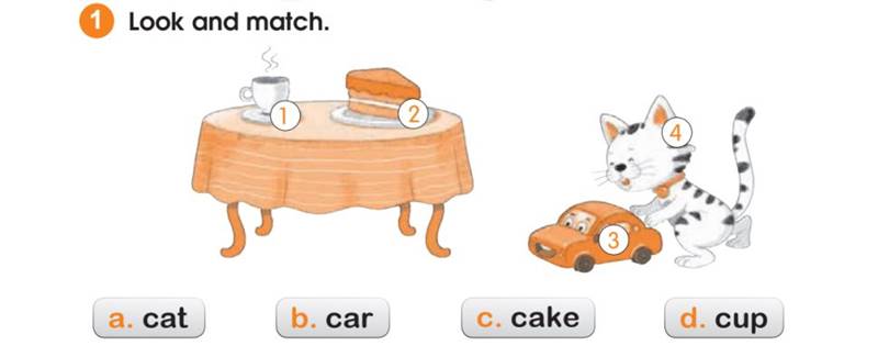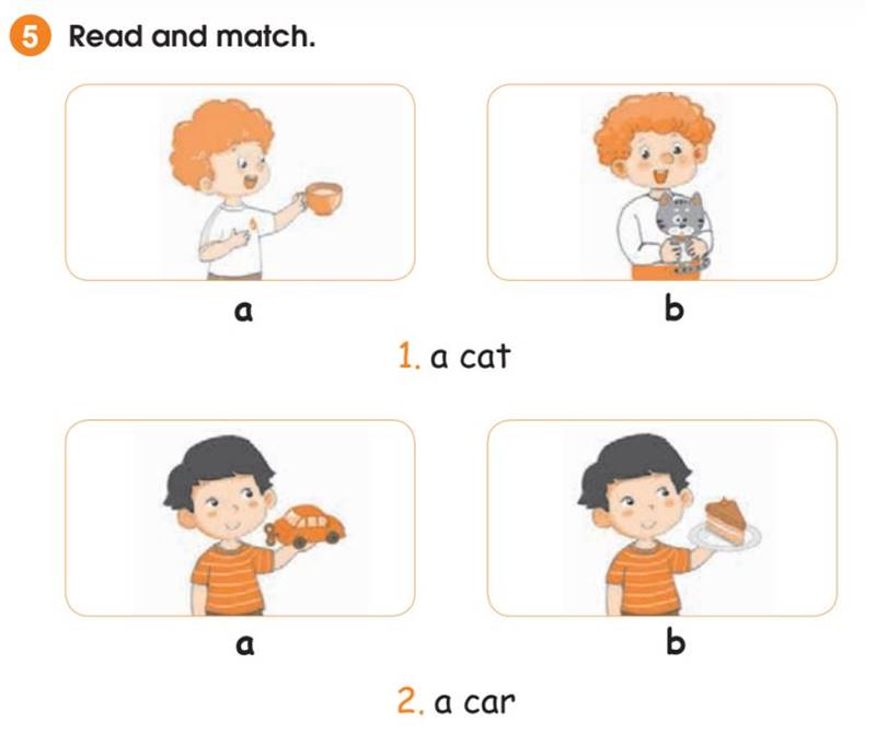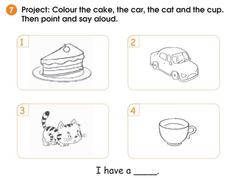 Exercise 7: Project. Find and colour the cake, the car, the cat and the cup. Then point and say aloud.