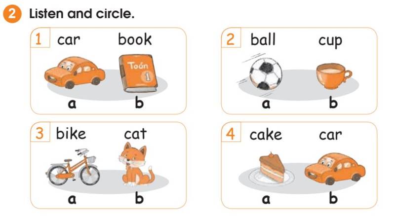 Hướng dẫn: Yêu cầu bài 2 là con cần nghe và khoanh tròn vào chữ cái a hoặc b tương ứng với tranh được nhắc đến. Để làm tốt, trước khi bật băng nghe, con cần quan sát cả 4 tranh một lượt, đọc lại các từ vựng xuất hiện trong đó. Khi đã nắm được cơ bản nội dung tranh, hay bắt đầu nghe và chọn đáp án.