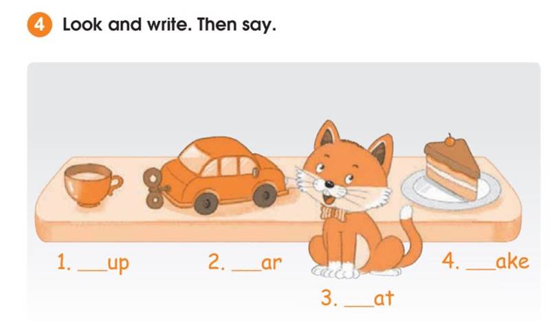 1. Nhìn và viết, sau đó nói. Bài 4 cho 1 bức tranh kèm các từ còn thiếu chữ cái. Nhiệm vụ của con là điền chữ cái còn thiếu dựa theo trí nhớ từ vựng để tạo thành từ đúng.