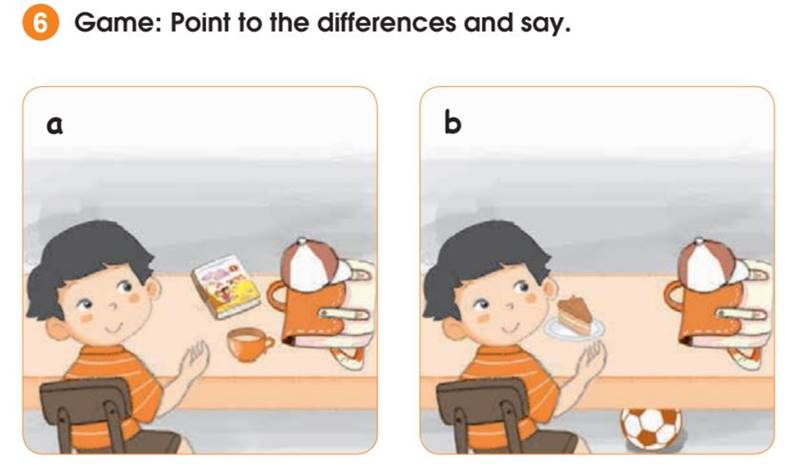 Hướng dẫn: Đây là một câu đố. Con cần xem tranh minh họa, sau đó tìm điểm khác nhau giữa 2 bức tranh. Tiếp đó, con hãy chỉ vào điểm khác nhau đó và nói.