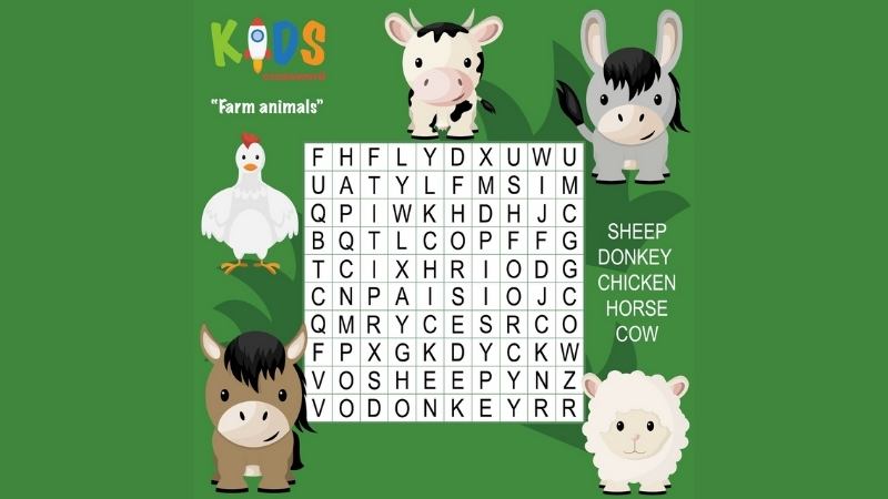 Bé tìm các từ chỉ con vật trong bảng ô chữ sau (Các từ cần tìm là SHEEP, DONKEY, CHICKEN, HORSE, COW)