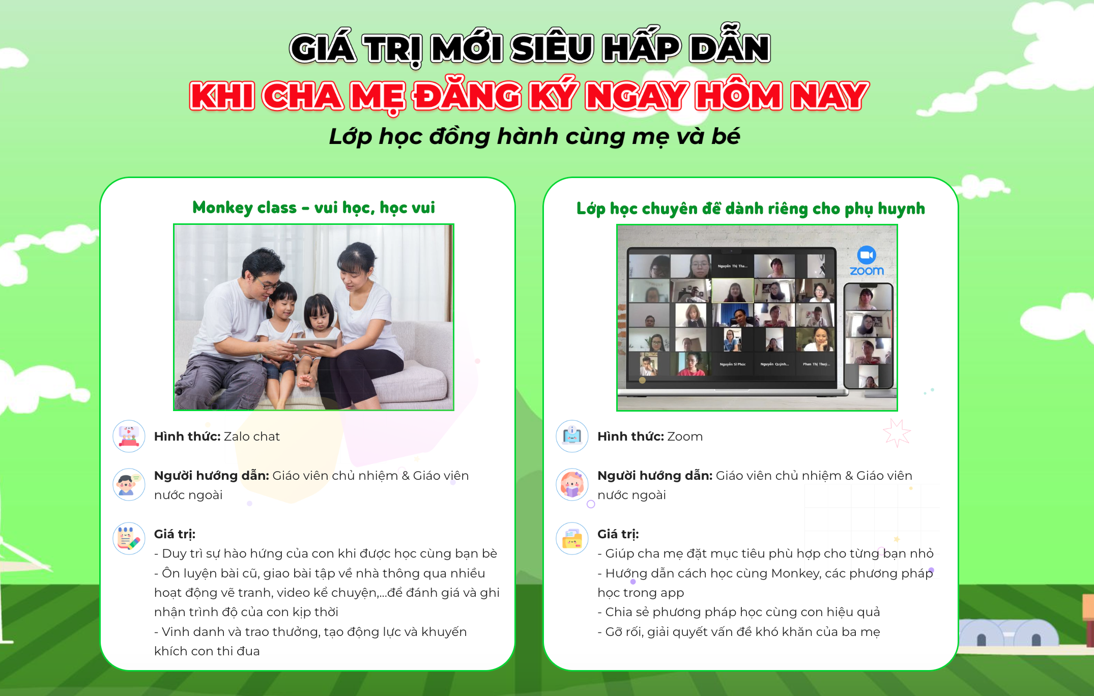 CƠ HỘI LỚN CHO BA MẸ >>> NHẬN GIÁ TRỊ SIÊU HẤP DẪN HÔM NAY Đăng ký ngay khóa học cùng Monkey Junior, con được tiếp cận: 2000+ từ vựng, 5170+ bài học, 74.300+ audio giọng đọc chuẩn bản xứ, 1200+ luật phát âm, 56 chủ đề trong cuộc sống, kho trò chơi đa dạng. Monkey Junior giúp con: