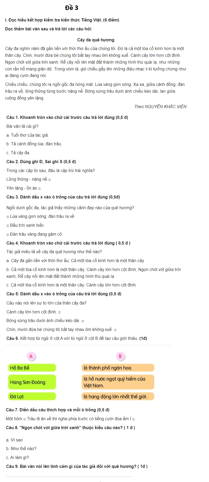 Nội dung đề thi tiếng Việt lớp 2 thường có những gì?