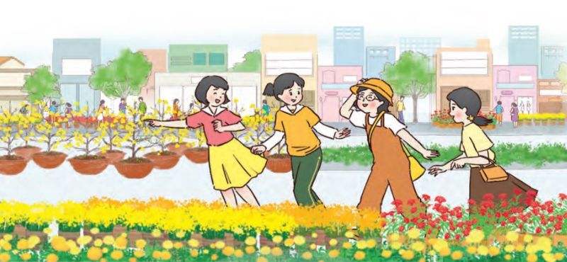 Trời nhiều nắng, cây cối xanh tươi, đường phố trang trí nhiều chậu cúc vàng |