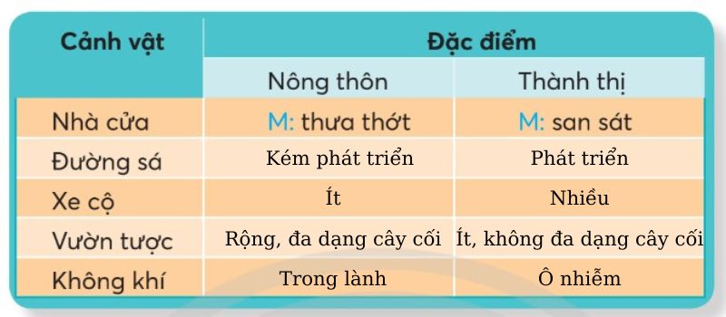 Câu 1: Tìm các từ ngữ thường dùng để chỉ đặc điểm của cảnh vật ở nông thôn và thành thị.