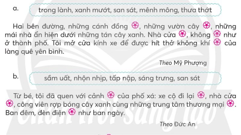 a. Hai bên đường, những cánh đồng mênh mông, những vườn cây xanh mướt, những mái nhà ẩn hiện dưới tán cây xanh. Nhà cửa thưa thớt, không san sát như ở thành phố. Tôi mở cửa kính xe để hít thở không khí trong lành của làng quê thanh bình.
