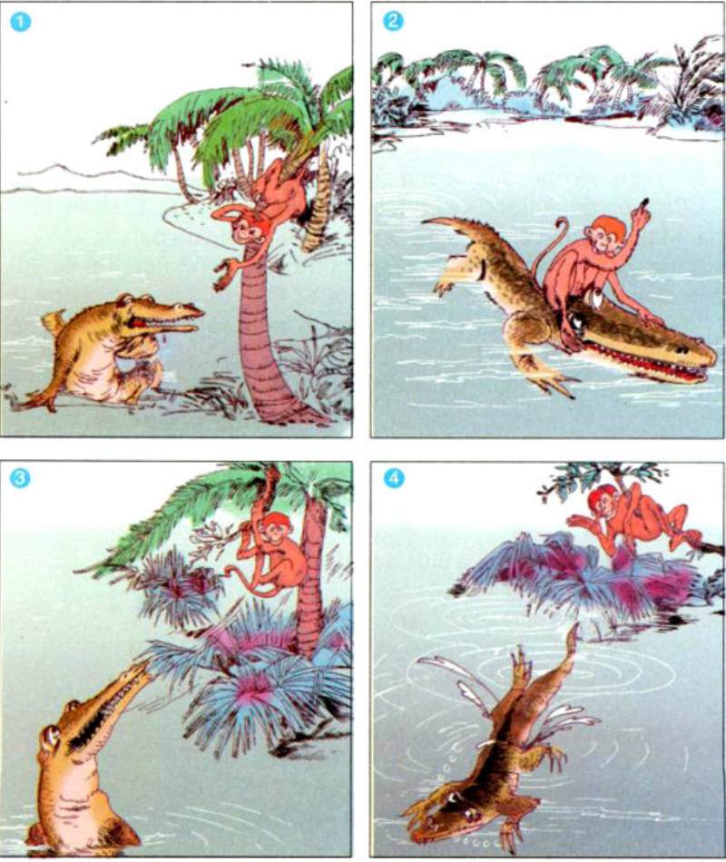 - Bạn là ai ? Vì sao bạn khóc ? - Tôi là Cá Sấu. Tôi khóc vì chả ai chơi với tôi. Khỉ nghe vậy, mời Cá Sấu kết bạn. Từ đó, ngày nào Cá Sấu cũng đến, ăn những hoa quả mà Khỉ hái cho. |
