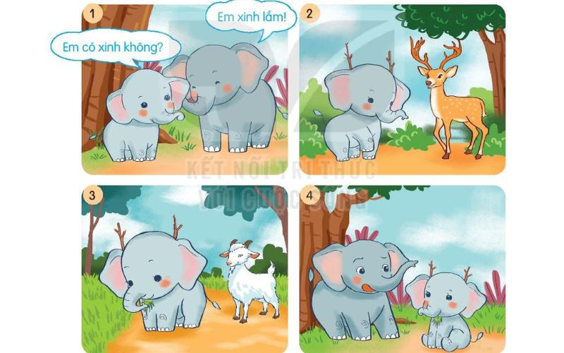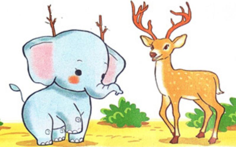 Tranh 2: Một hôm, voi em gặp hươu con, nó hỏi “Tớ có xinh không?”. Hươu trả lời “Chưa xinh lắm vì cậu không có đôi sừng giống tớ”. Nghe xong, voi em liền nhặt vài cành cây khô gài lên đầu cho giống hươu.