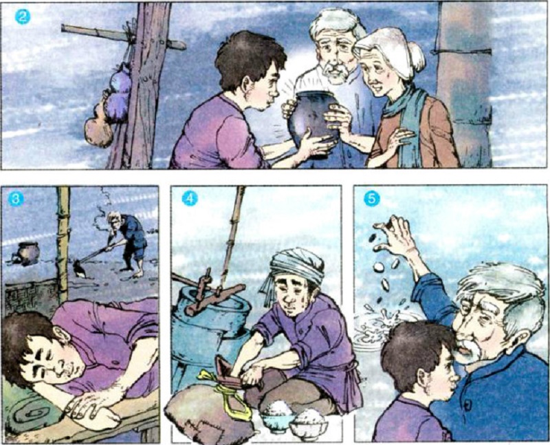 Câu 1. Sắp xếp lại các tranh theo đúng thứ tự trong câu chuyện Hũ bạc của người cha