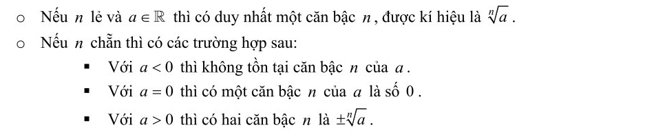 Định nghĩa: Cho số thực b và số nguyên dương n (n ≥ 2). Số a được gọi căn bậc n của số b nếu an = b.