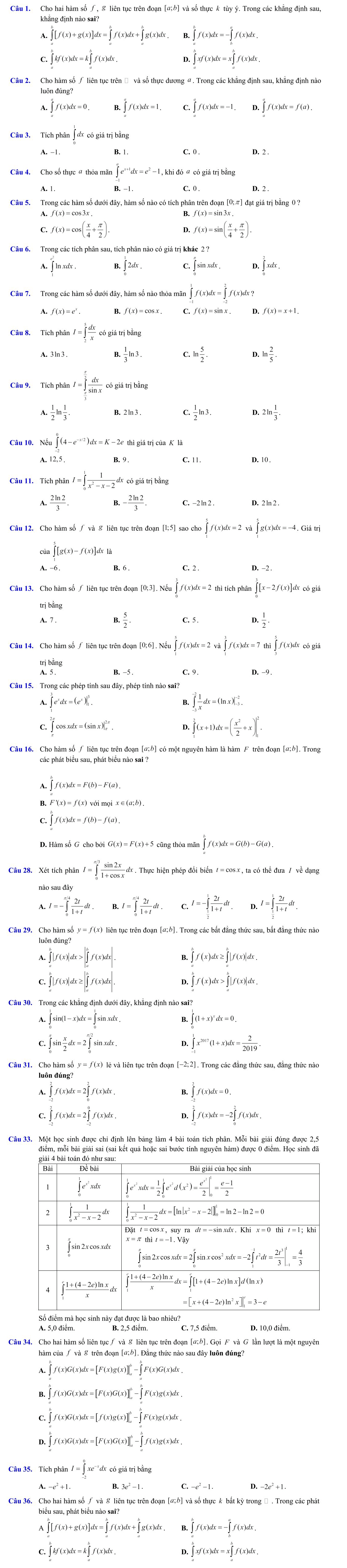 Đáp án bài tập nguyên hàm tích phân trắc nghiệm |