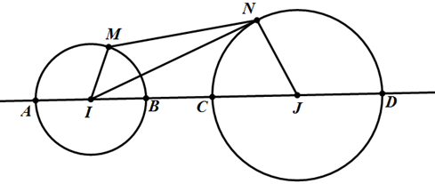 Cho hai đường tròn (T1) có tâm I, bán kính R1; đường tròn (T2) có tâm J, bán kính R2. Tìm vị trí của điểm M trên (T1), điểm N trên (T2) sao cho MN đạt giá trị lớn nhất, nhỏ nhất.