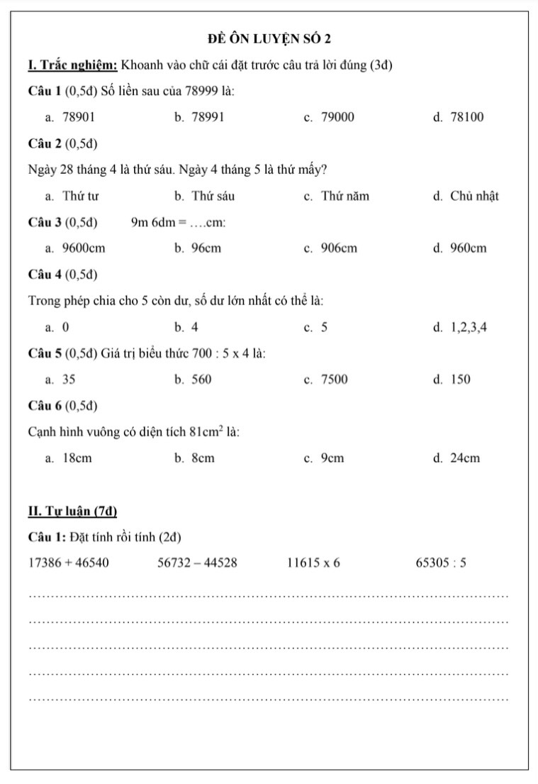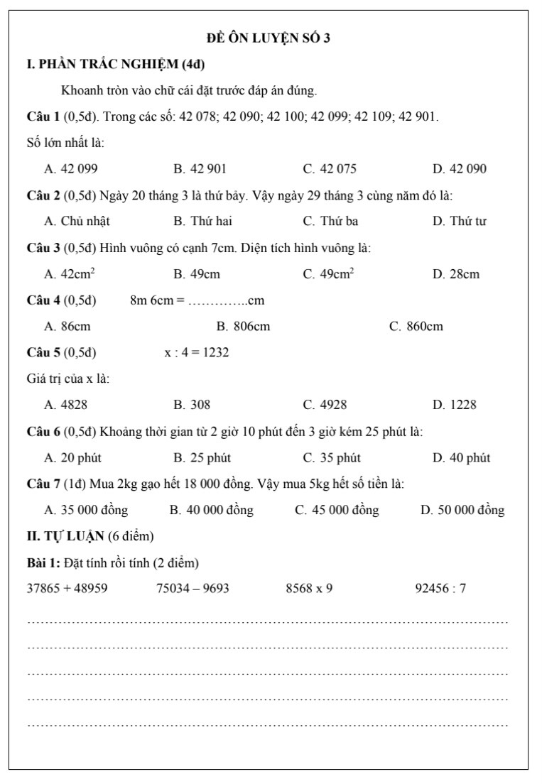 Sau khi đã ôn lại lý thuyết, việc luyện đề là bước tiếp theo giúp học sinh củng cố kiến thức, rèn luyện kỹ năng làm bài và tăng sự tự tin trước khi vào lớp 4. Dưới đây là tổng hợp các đề toán lớp 3 lên lớp 4 được chọn lọc kỹ lưỡng, phù hợp với năng lực học sinh, mỗi đề đều có đáp án chi tiết để ba mẹ dễ dàng đồng hành cùng con trong quá trình ôn luyện.