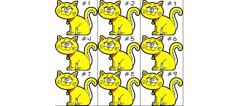Như trong hình bên dưới bạn thấy có 9 con mèo và nhìn chúng bạn nghĩ là nó giống nhau, nhưng thực sự chỉ có 2 con giống nhau. Tìm 2 con mèo giống nhau đó?