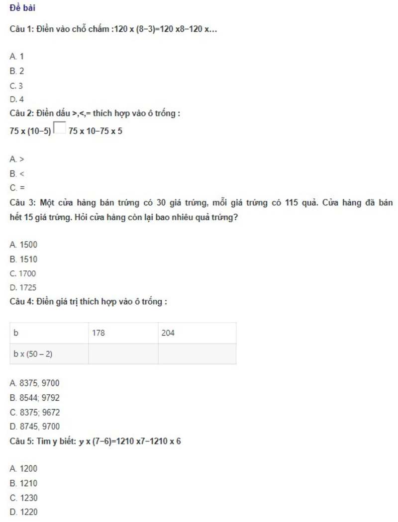 Một số bài toán lớp 4 nhân một số với một hiệu để các em luyện tập