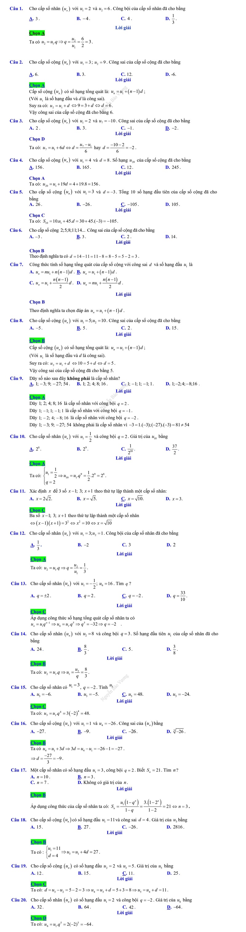20+ Bài tập trong đề kiểm tra cấp số cộng cấp số nhân ôn thi THPT Quốc Gia