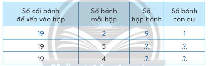 Để tìm số hộp bánh ta lấy số cái bánh để xếp vào hộp chia cho số bánh mỗi hộp. Trong đó: