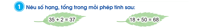 b. Trong phép tính 18 + 50 = 68 thì 18 và 50 được gọi là số hạng; 68 hoặc 18 + 50 được gọi là tổng của hai số hạng.