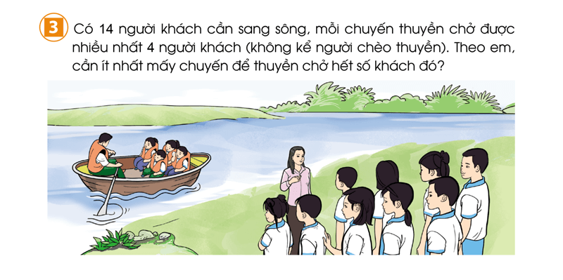 Hướng dẫn giải: Ta có phép tính, 14 : 4 = 3 dư 2. Suy ra, chúng ta cần ít nhất 4 chuyến để chở hết số khách mà đề bài cung cấp.