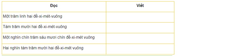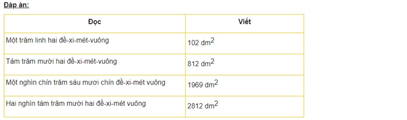 Phương pháp giải: Các em cũng chỉ cần đọc và viết như các số tự nhiên, sau đó thêm tiền đố đề xi mét vuông phía sau là được.