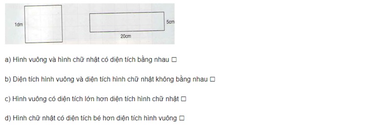Diện tích hình vuông là: 1 x 1 = 1 (dm²); 1 dm² = 100 cm².