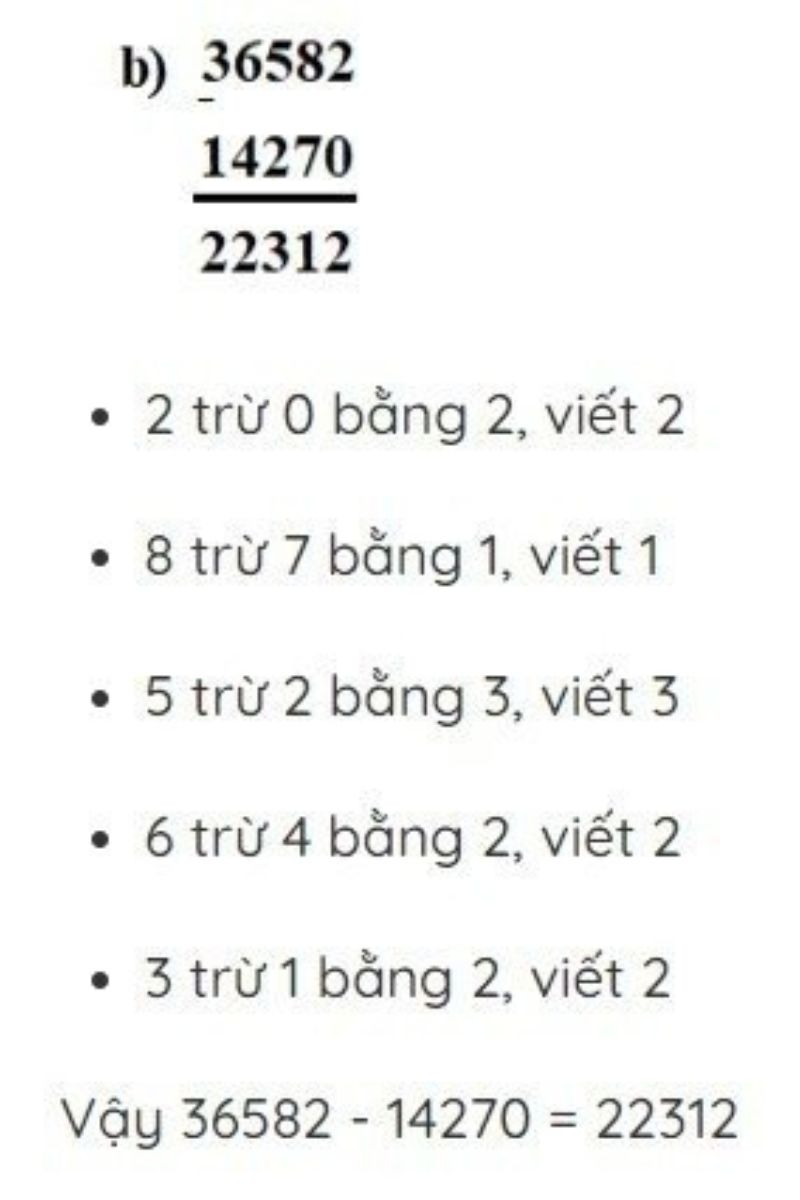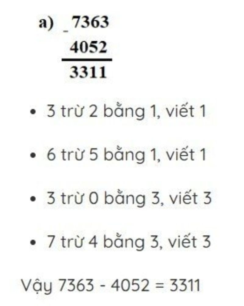 Trừ các chữ số tự nhiên theo thứ tự từ phải qua trái. Hàng đơn vị, hàng trăm, hàng nghìn,...