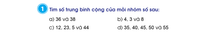 d. Số trung bình cộng của 35, 40, 45, 50 và 55 là: (35 + 40 + 45 + 50 + 55) : 5 = 45.