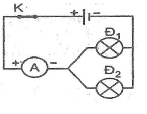 Câu 5: Trong mạch điện có sơ đồ như hình, ampe kế có số chỉ I = 0,54A. Biết cường độ dòng điện đi qua đèn Đ1 lớn gấp hai lần cường độ dòng điện đi qua đèn Đ2