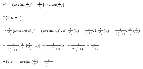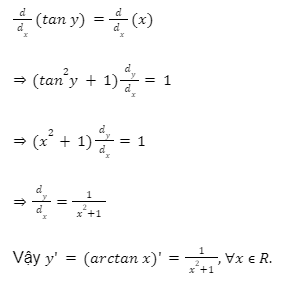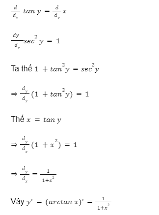 Từ định nghĩa của hàm arctan và y = arctan x ta có tan y = x. Lấy đạo hàm theo biến x ta được phương trình như sau:
