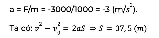 Câu 6: Một ôtô có khối lượng 1 tấn đang chuyển động với v = 54km/h thì tắt máy, hãm phanh, chuyển động chậm dần đều. Biết độ lớn lực hãm 3000N. Xác định quãng đường xe đi được cho đến khi dừng lại.