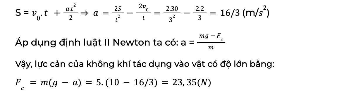 Câu 10: Một vật khối lượng 5kg được ném thẳng đứng hướng xuống với vận tốc ban đầu 2m/s từ độ cao 30m. Vật này rơi chạm đất sau 3s sau khi ném. Cho biết lực cản không khí tác dụng vào vật không đổi trong quá trình chuyển động. Lấy g = 10m/s^2. Lực cản của không khí tác dụng vào vật có độ lớn bằng: