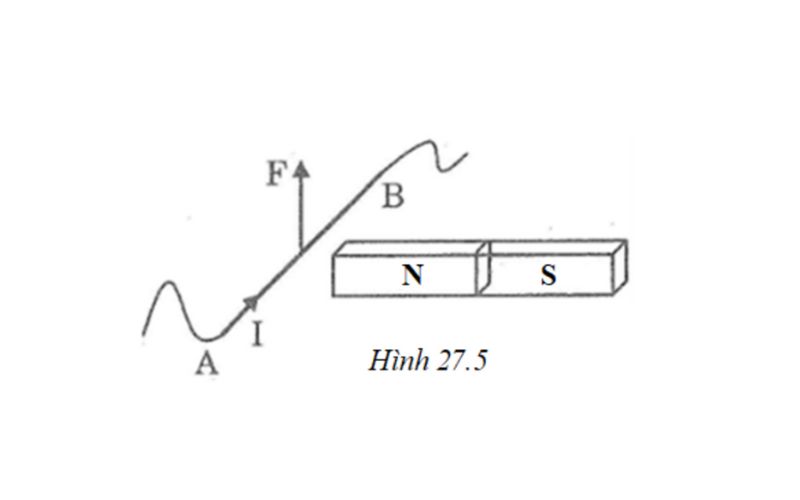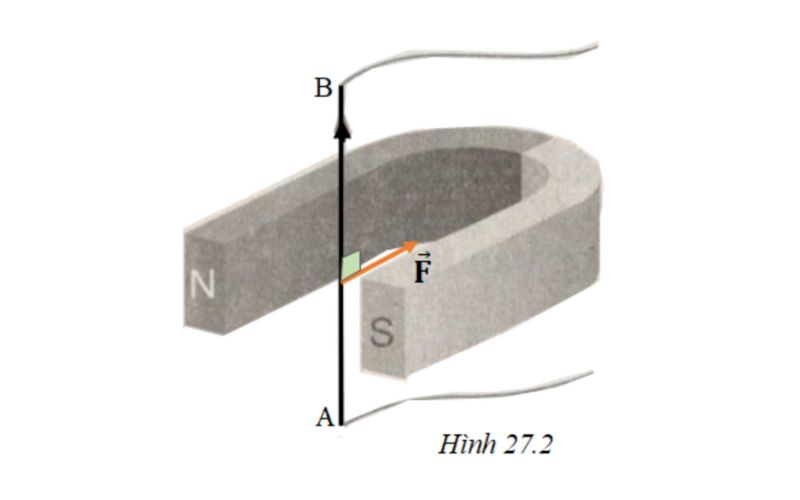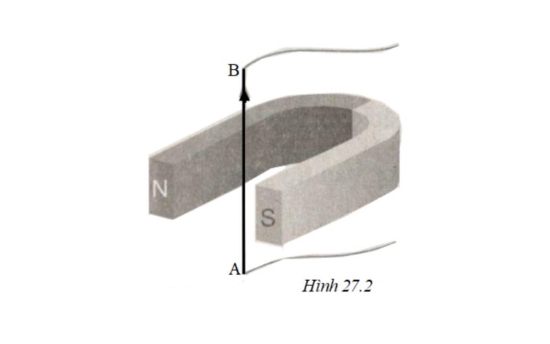 Bài 2 (Trang 61 SBT): Hình 27.2 mô tả đoạn dây AB có dòng điện đi qua được đặt ở khoảng giữa hai cực của nam châm hình chữ U. Biểu diễn lực điện từ tác dụng vào AB. Nếu đổi chiều dòng điện hoặc đổi cực của nam châm thì lực điện từ sẽ ra sao?
