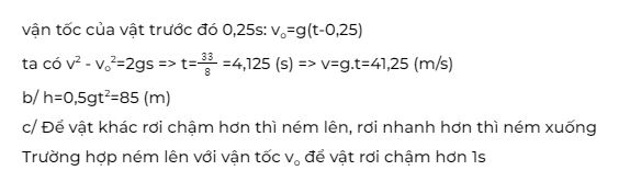 c/ Nếu từ độ cao này người ta ném thẳng đứng một vật khác thì phải ném với vận tốc bằng bao nhiêu và phải theo hướng nào để vật rơi xuống tới mặt đất chậm hơn (và nhanh hơn ) vật rơi tự do khoảng thời gian 1s.