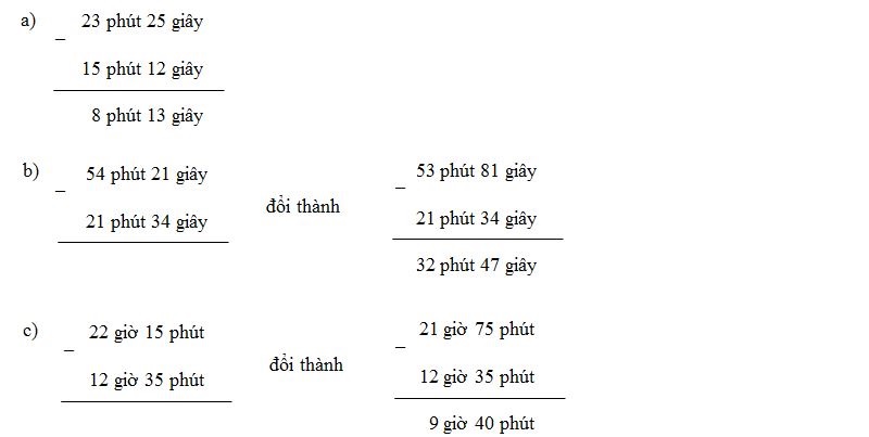 a) 23 phút 25 giây – 15 phút 12 giây;