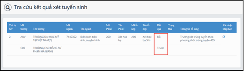 Với mỗi nguyện vọng, kết quả chỉ có 2 trạng thái: Đỗ hoặc Trượt. -> Nếu tất cả nguyện vọng đều hiển thị “Trượt” nghĩa là thí sinh không trúng tuyển bất kỳ trường nào.