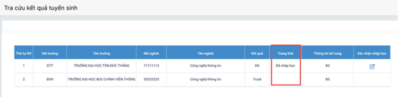 Sau khi xác nhận thành công, trạng thái sẽ chuyển thành Đã nhập học. -> Thí sinh nên chụp màn hình hoặc lưu lại kết quả này để phòng trường hợp cần đối chiếu sau.