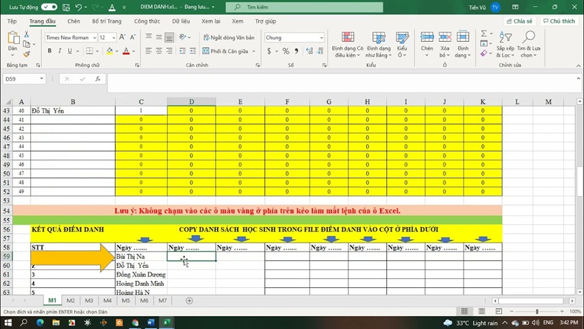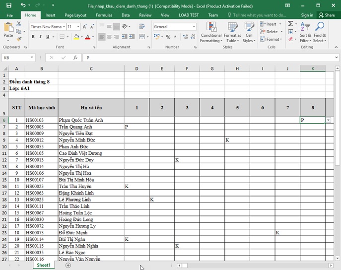Một số lưu ý khi điểm danh học sinh trên file excel