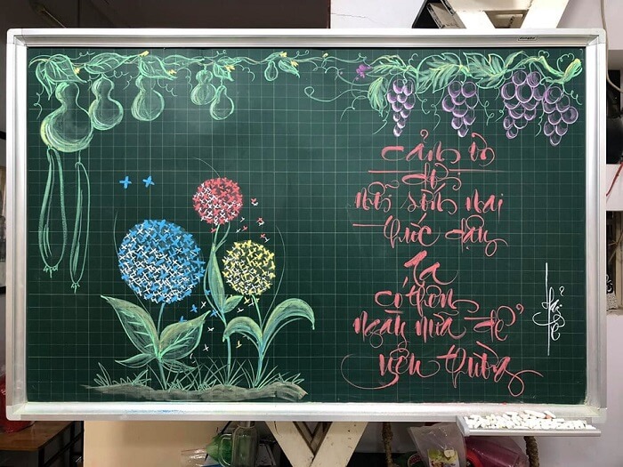 Lựa chọn chất liệu đa dạng để trang trí từ phấn màu, giấy màu, hoa giấy, hình vẽ tay cho đến các sản phẩm thủ công do học sinh tự làm để bảng thêm sinh động và gần gũi