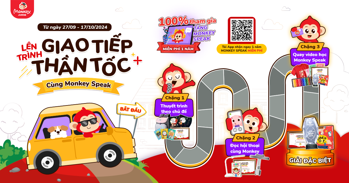 Monkey chính thức bắt đầu chuỗi hoạt động phát triển khả năng giao tiếp Tiếng Anh dành cho bé với gần 20 giải thưởng cực hấp dẫn! Chuỗi hoạt động gồm 3 chặng, mỗi chặng diễn ra trong vòng 1...