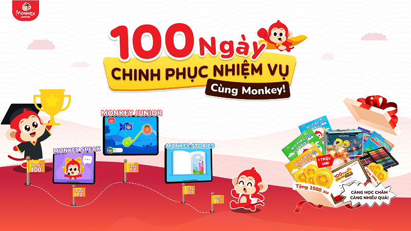 Ba mẹ đang tìm cách để con yêu học tiếng Anh hiệu quả và bền bỉ mỗi ngày? Hãy cùng Monkey tham gia ngay chương trình đặc biệt “100 ngày chinh phục nhiệm vụ cùng Monkey!”. Đây không chỉ là một hoạt động thú vị giúp bé rèn luyện 4 kỹ năng Nghe - Nói - Đọc - Viết mà còn là cơ hội để bé khám phá bản thân, kiên trì học tập và nhận về những phần quà hấp dẫn hàng tuần, hàng tháng.