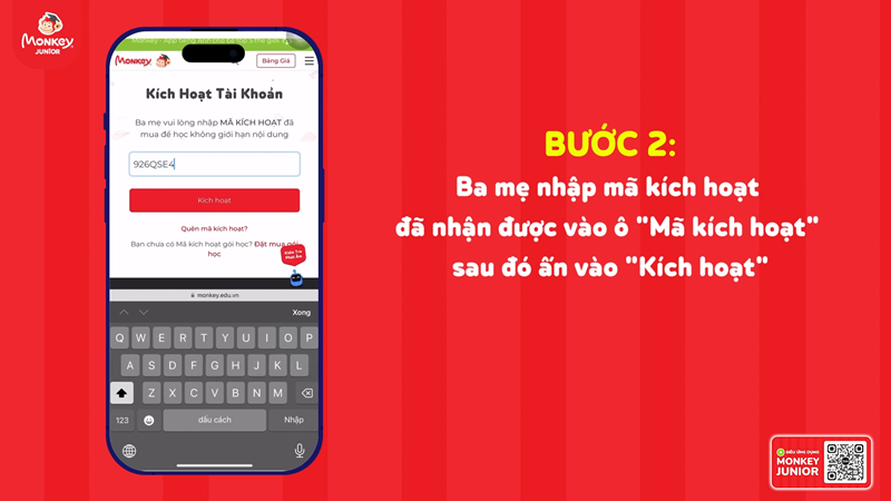 Bước 2: Ba mẹ nhập mã kích hoạt đã nhận được vào ô MÃ KÍCH HOẠT, sau đó ấn KÍCH HOẠT.