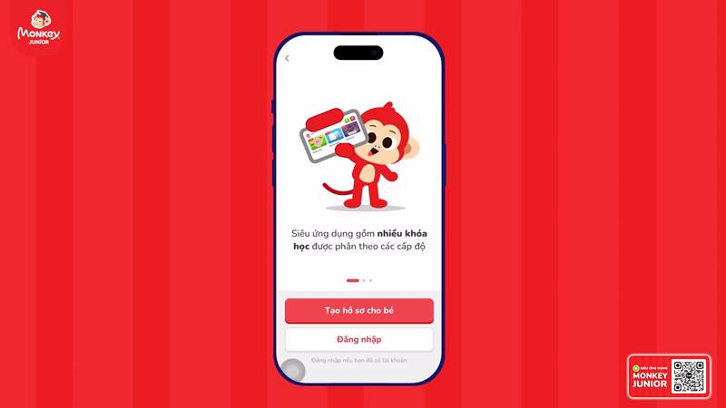 Ở bước này Monkey Junior sẽ đưa ra hai sự lựa chọn, gồm: Tạo hồ sơ cho bé và Đăng nhập. Để kích hoạt tài khoản ba mẹ chọn ĐĂNG NHẬP.