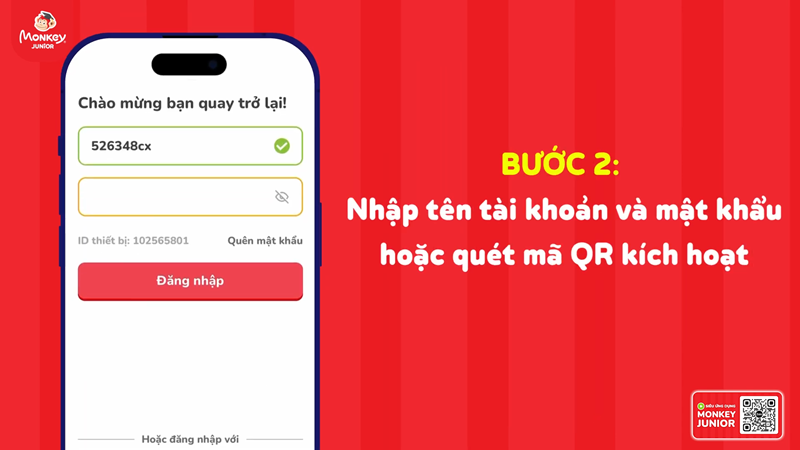 Sau khi kích hoạt thành công tài khoản trên website, ba mẹ mở lại ứng dụng Monkey Junior để đăng nhập bằng tài khoản vừa kích hoạt.