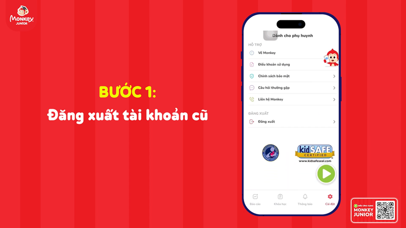 Ba mẹ vui lòng mở ứng dụng Monkey Junior, sau đó đăng xuất tài khoản cũ của mình. Để đăng xuất tài khoản, ba mẹ vào BIỂU TƯỢNG AVATAR của con, sau đó chọn DÀNH CHO BA MẸ rồi nhấn số theo hướng dẫn, nhấn tiếp vào mục CÀI ĐẶT, kéo xuống phía dưới và chọn ĐĂNG XUẤT.