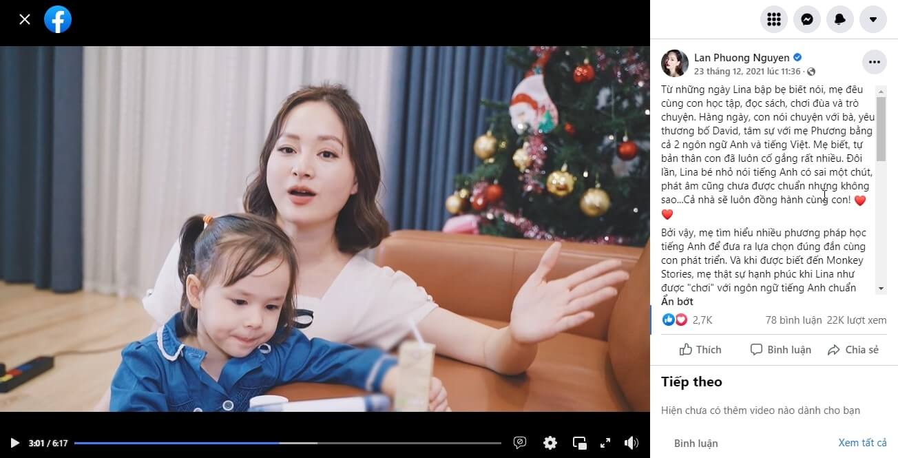 Trong đoạn clip được đăng tải, dễ thấy rằng bé Lina có thể giao tiếp tiếng Anh với mẹ trôi chảy dù cô bé chỉ mới 3 tuổi. Lan Phương cũng chia sẻ thêm, phương pháp học đến từ Monkey Stories, giúp trẻ dễ dàng phát triển toàn diện và nhanh chóng 4 kỹ năng. Ngoài ra, còn giúp tối ưu thời gian, tiết kiệm chi phí và nhất là giúp tăng cường hứng thú học cho con.