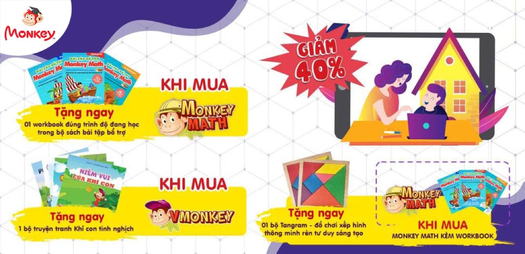 Giảm 40% khi mua gói học Monkey Math hoặc VMonkey (áp dụng với các gói 1 năm trở lên). Đồng thời tặng ngay 1 trong 3 phần quà sau khi mua các gói học tương ứng: